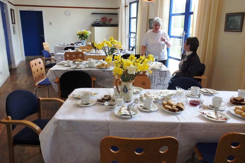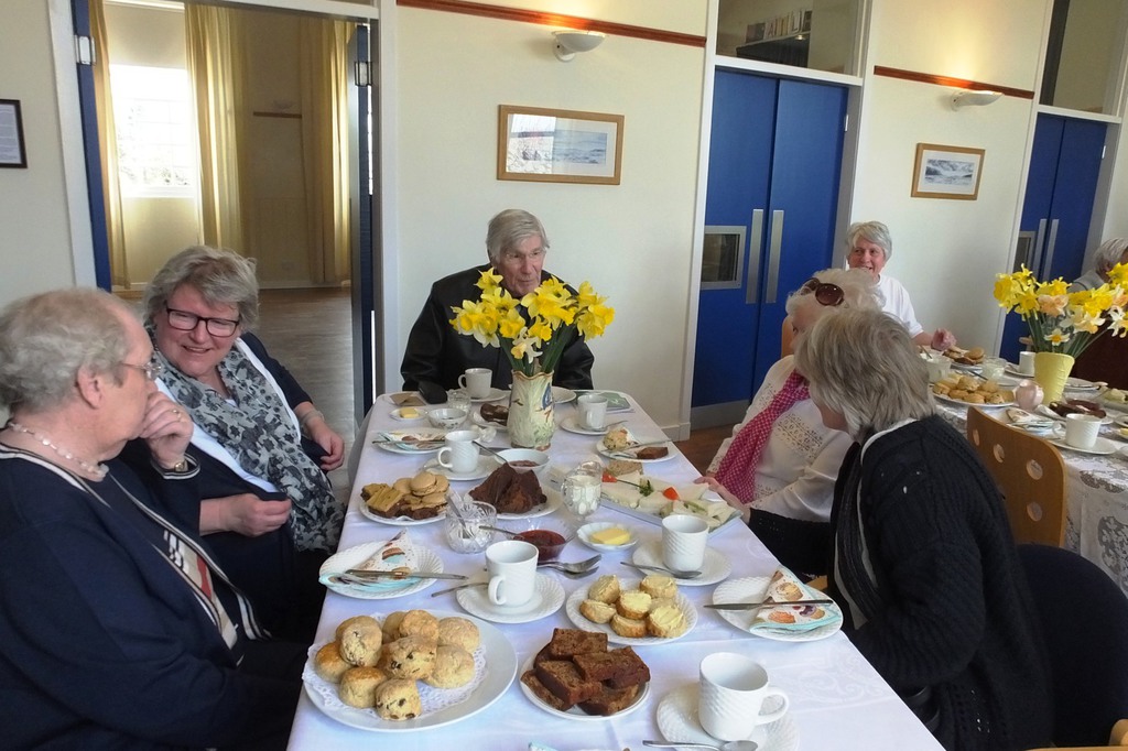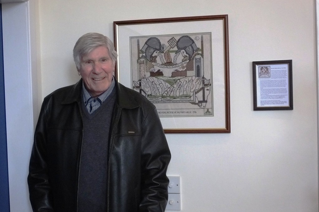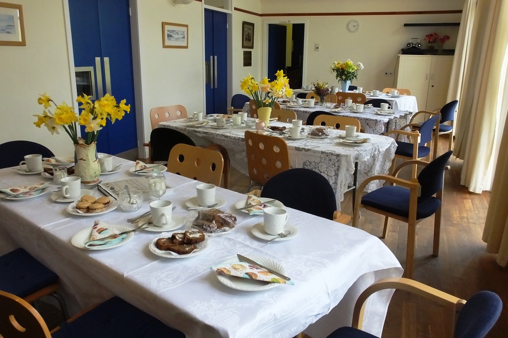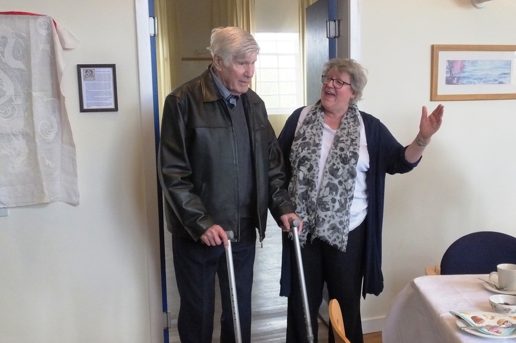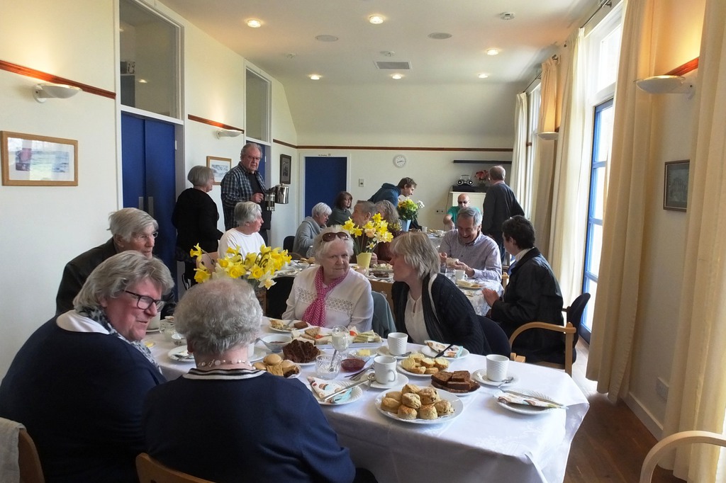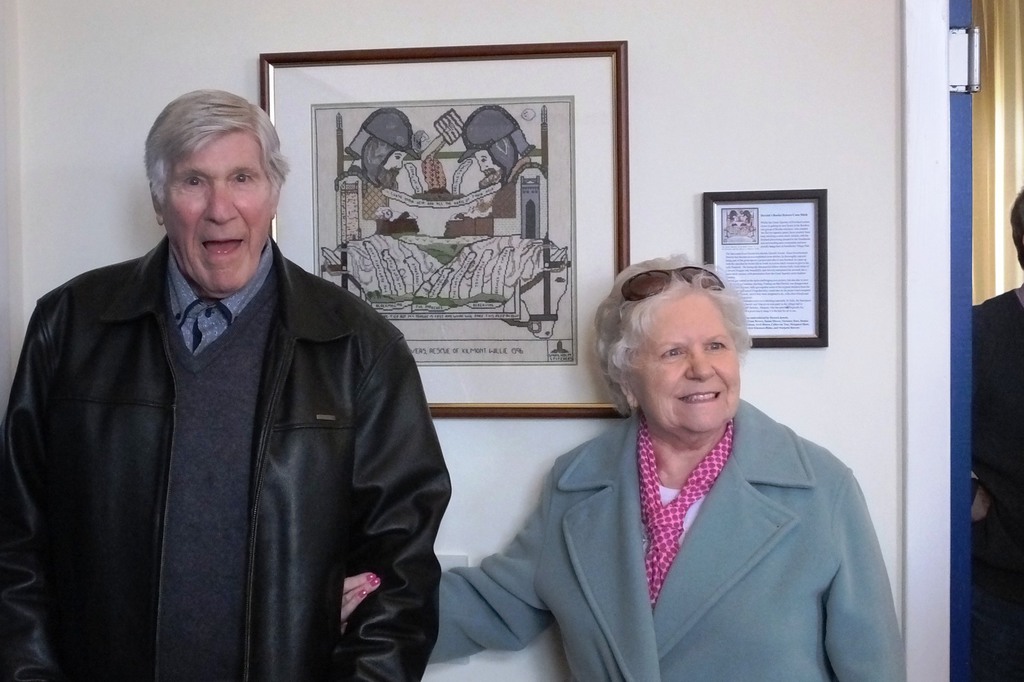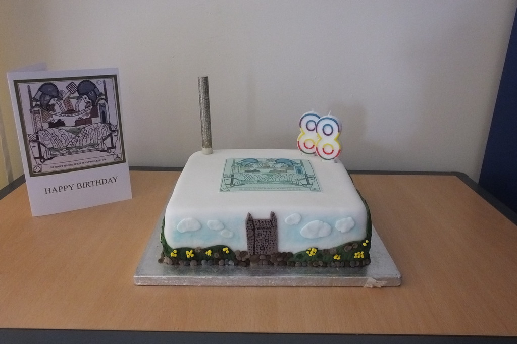 This all seemed to call for some sort of a celebration! Completion coincided with Derrick’s birthday and we’re always up for a party. So on 29th April 2018, we hung the picture on the hall wall, and, in collusion with Derrick's wife Marjorie, brought him up “to see the finished work”. A bit suspicious at the number of cars outside when he arrived, the ensuing birthday tea (sandwiches with the crusts cut off, scones and homemade jam,lots of lovely cakes) was a complete surprise! Attendance from Smailholm Stitchers and Derrick’s friends in the village made for a lovely afternoon. We’re grateful to Derrick for his wonderful idea. Sadly, he died a few months later, but we are very happy to know that from his inspiration, the Border Reivers will still be hanging in the village hall a hundred years from now!